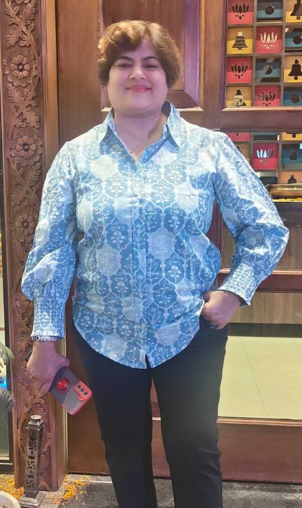 Elevate your wardrobe with this Heritage Print Sky Cotton Shirt 💙✨ – featuring a soft floral jaal print reminiscent of Mughal royalty. Designed in breathable cotton, this shirt blends traditional Indian artistry with modern puff-sleeve tailoring. The structured collar, smocked cuffs, and flowing silhouette make it a refined yet relaxed staple for the conscious dresser 🌿