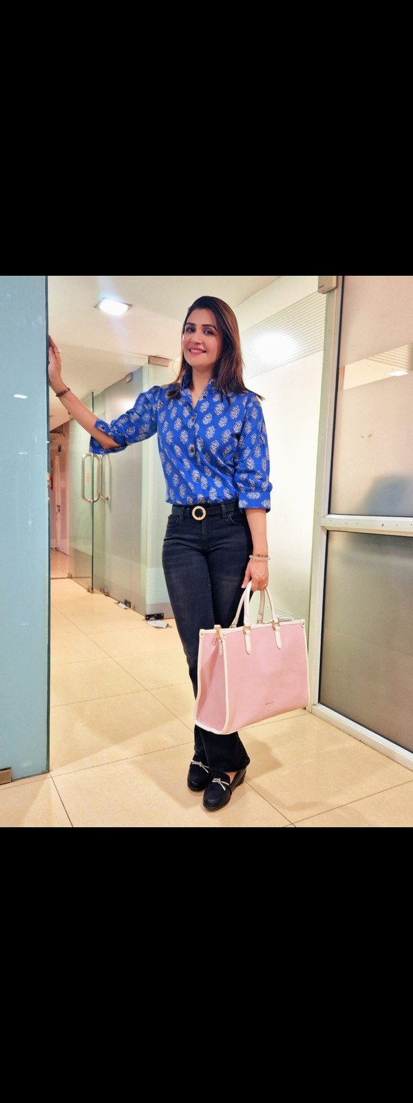 The stylish blue base, adorned with subtle block floral prints, paired with a sharp shirt collar and three-quarter cuffed sleeves, makes it perfect for a sleek, structured look.