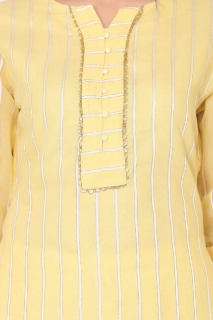 Elevate your ethnic wardrobe with this Women’s Mul Cotton Gold Checkered Panel Kurta, a perfect blend of elegance and comfort. Made from lightweight mul cotton, this kurta features subtle gold check panels that offer a festive yet minimal appeal. The straight silhouette ensures a graceful fit, making it suitable for everything from office meetings to small festive events. Style it with minimal jewelry or statement dupattas—this kurta is your go-to piece for effortless ethnic charm.