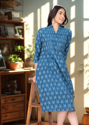 Blue Pintex Yoke Ikkat Cotton Midi Dress