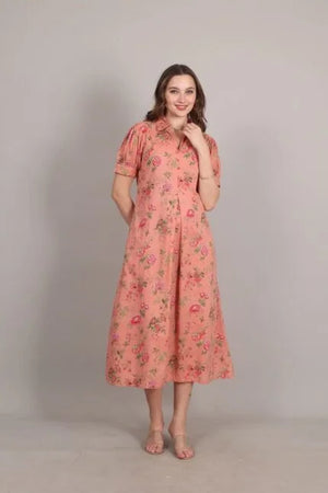 Step into floral elegance with our Peach Rose Flare Printed Midi Dress – your go-to outfit for breezy days and effortless charm! ☀️🌿