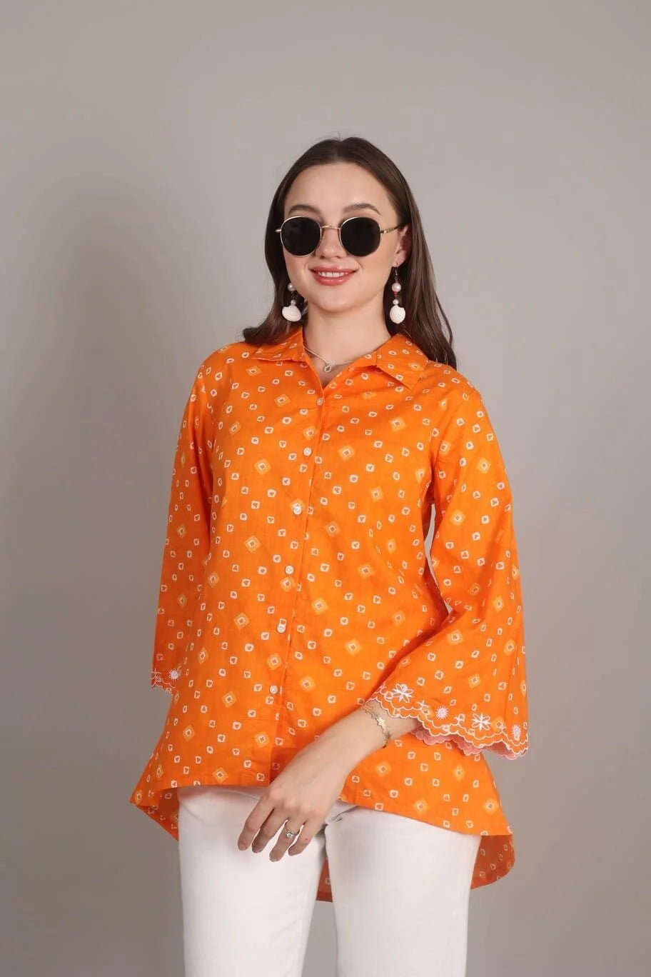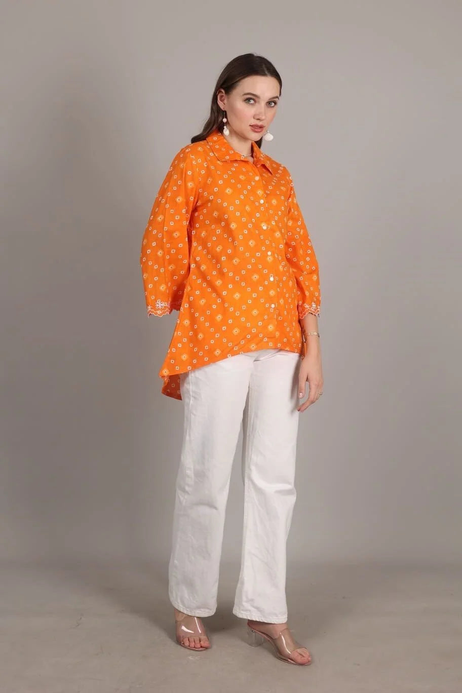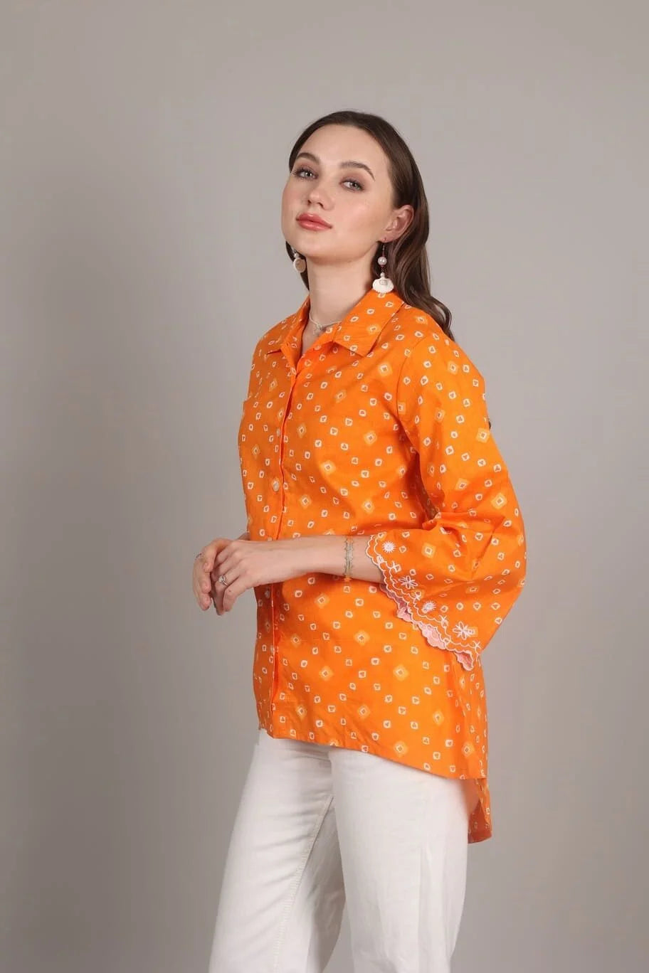 *Electrifying Orange Bandhani Print Embroidered Shirt