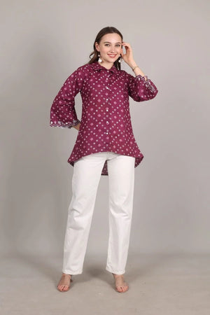 Make everyday styling effortlessly chic with our Wine Bandhni print Embroidered Shirt for Women 🌼✨